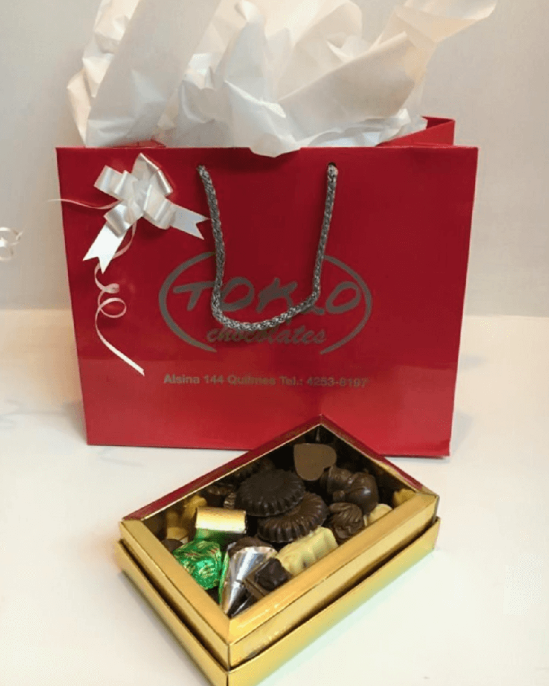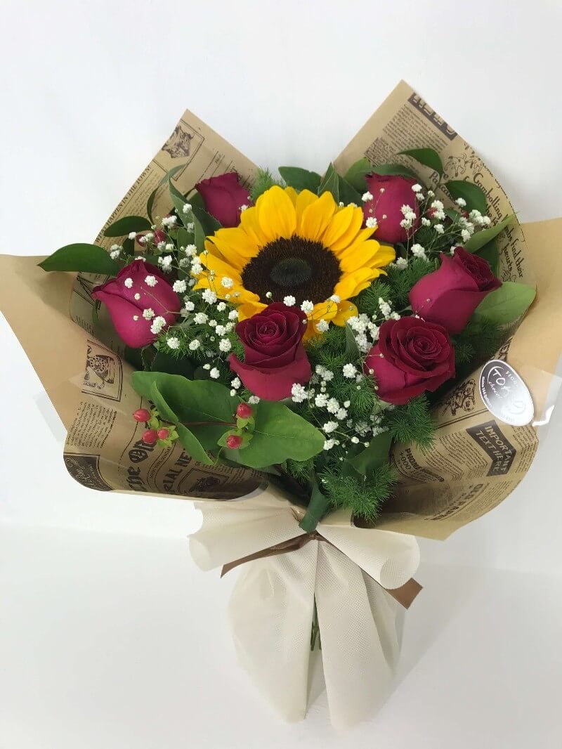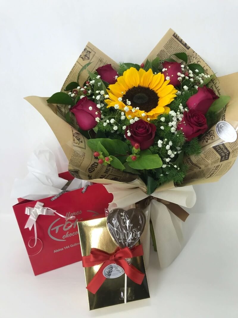Ramo Galileo de 1 girasol con 6 rosas nacionales alrededor. Caja dorada con 250 gs. de bombones de chocolate y Paleta (tenemos de felicidades, te amo, te quiero, feliz cumple, feliz día…..consultar)