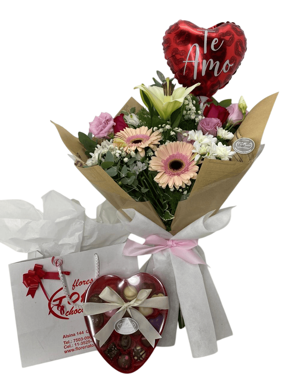 Va acompañado de un globo Te amo, feliz cumple, feliz Día (confirmar por nota en tu pedido cuál preferis).